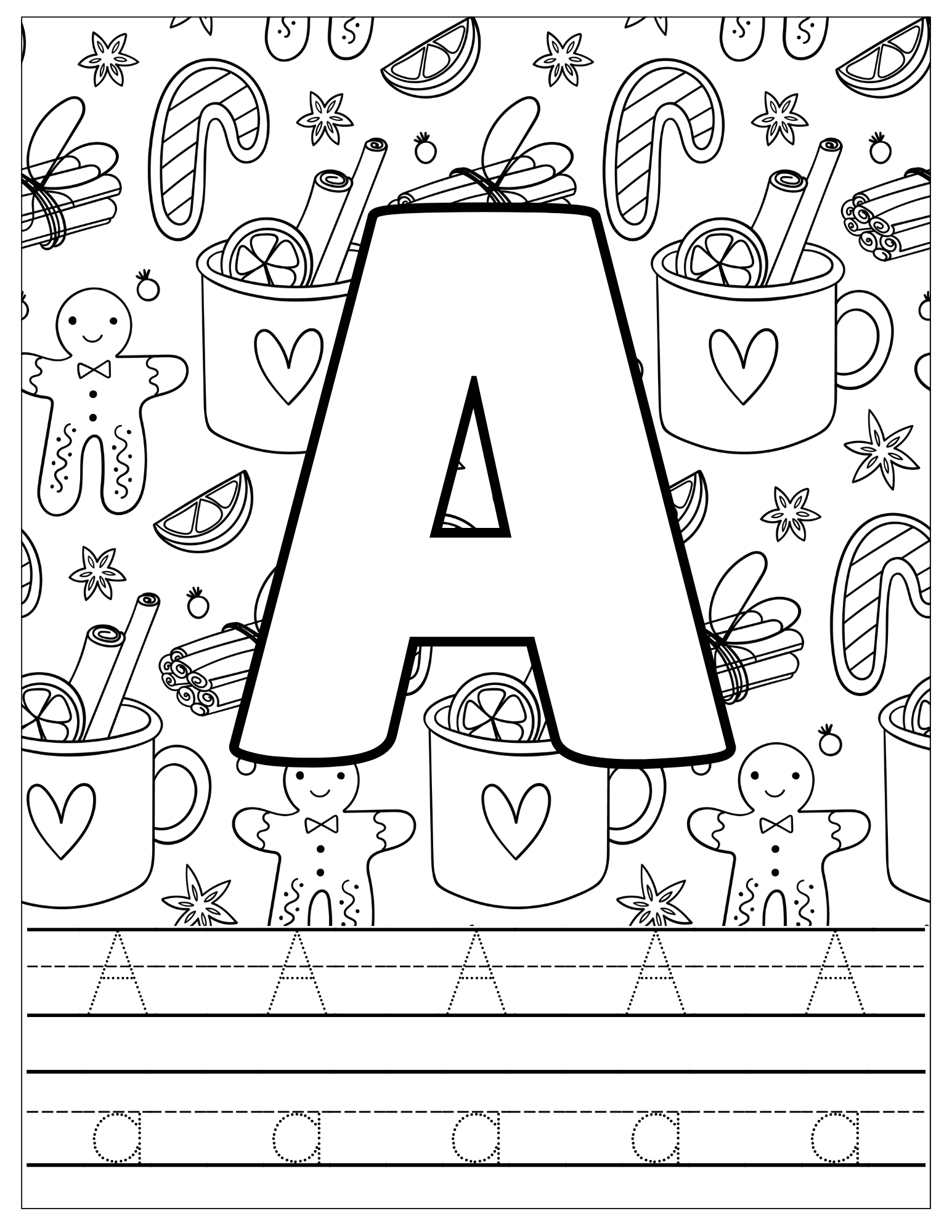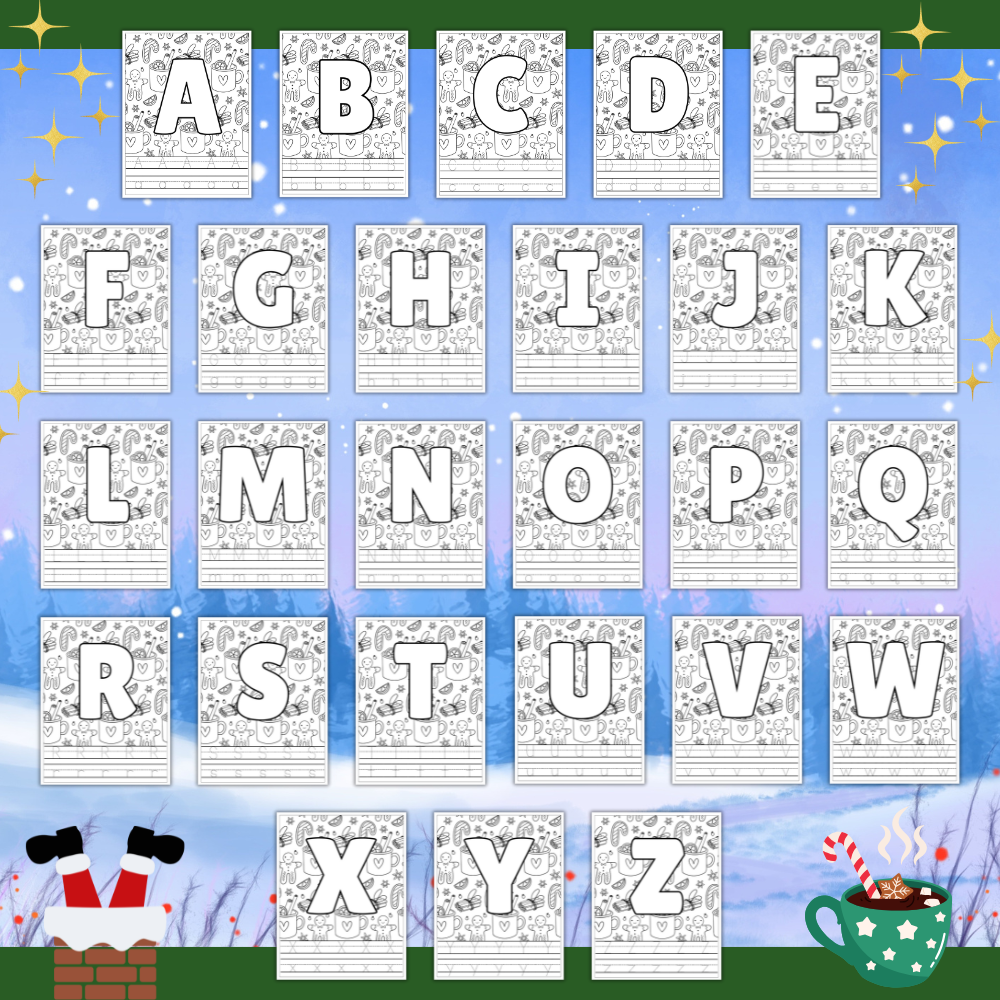 Tässä ihanassa jouluaiheisessa aakkosvärityskirjassa yhdistyvät oppiminen ja luova tekeminen. Jokaisella sivulla on yksi kirjain (A–Z), jota ympäröi jouluinen taustakuva. Alareunassa on harjoitusviivat kirjainten kirjoittamista varten.