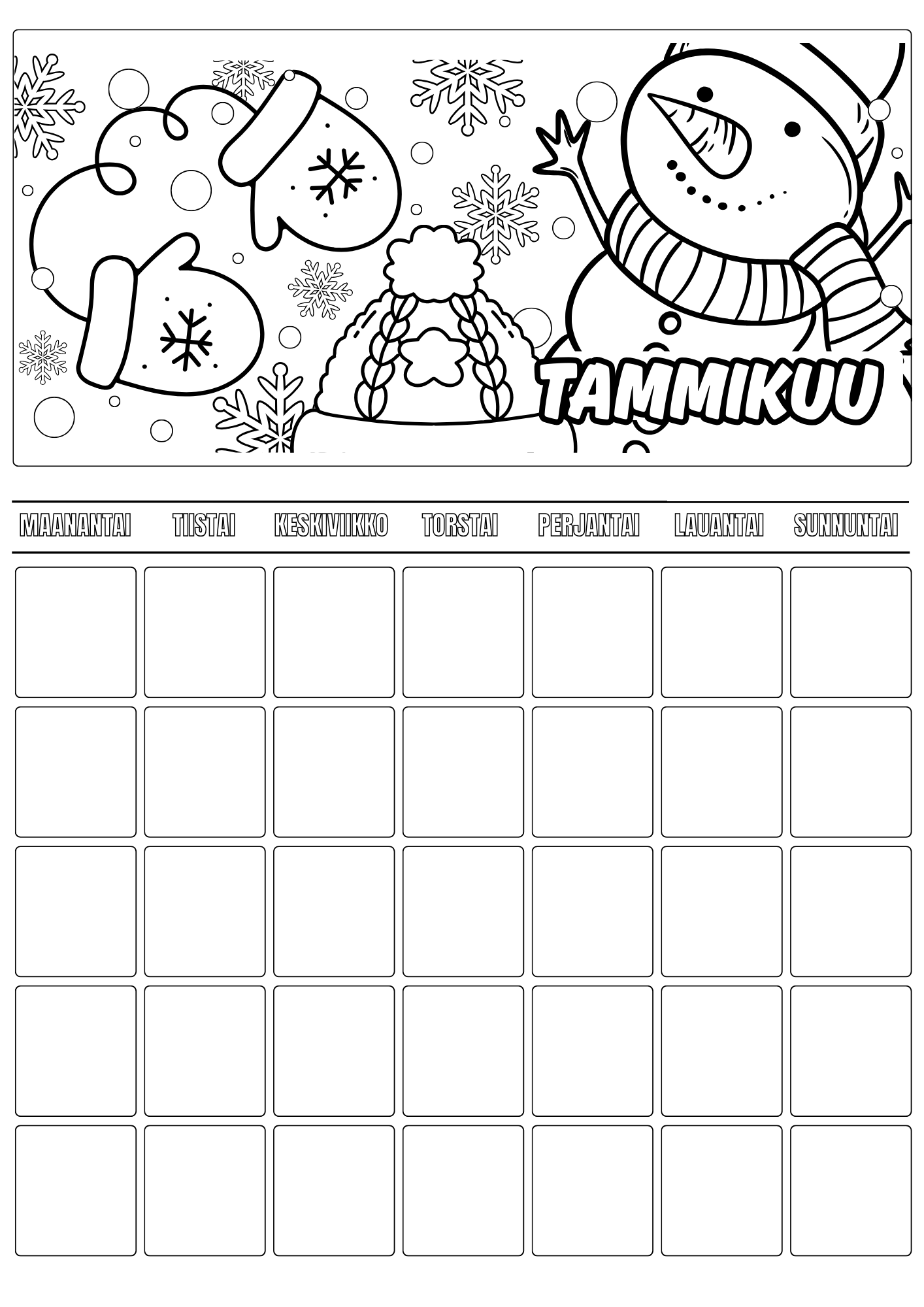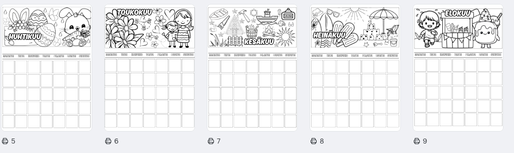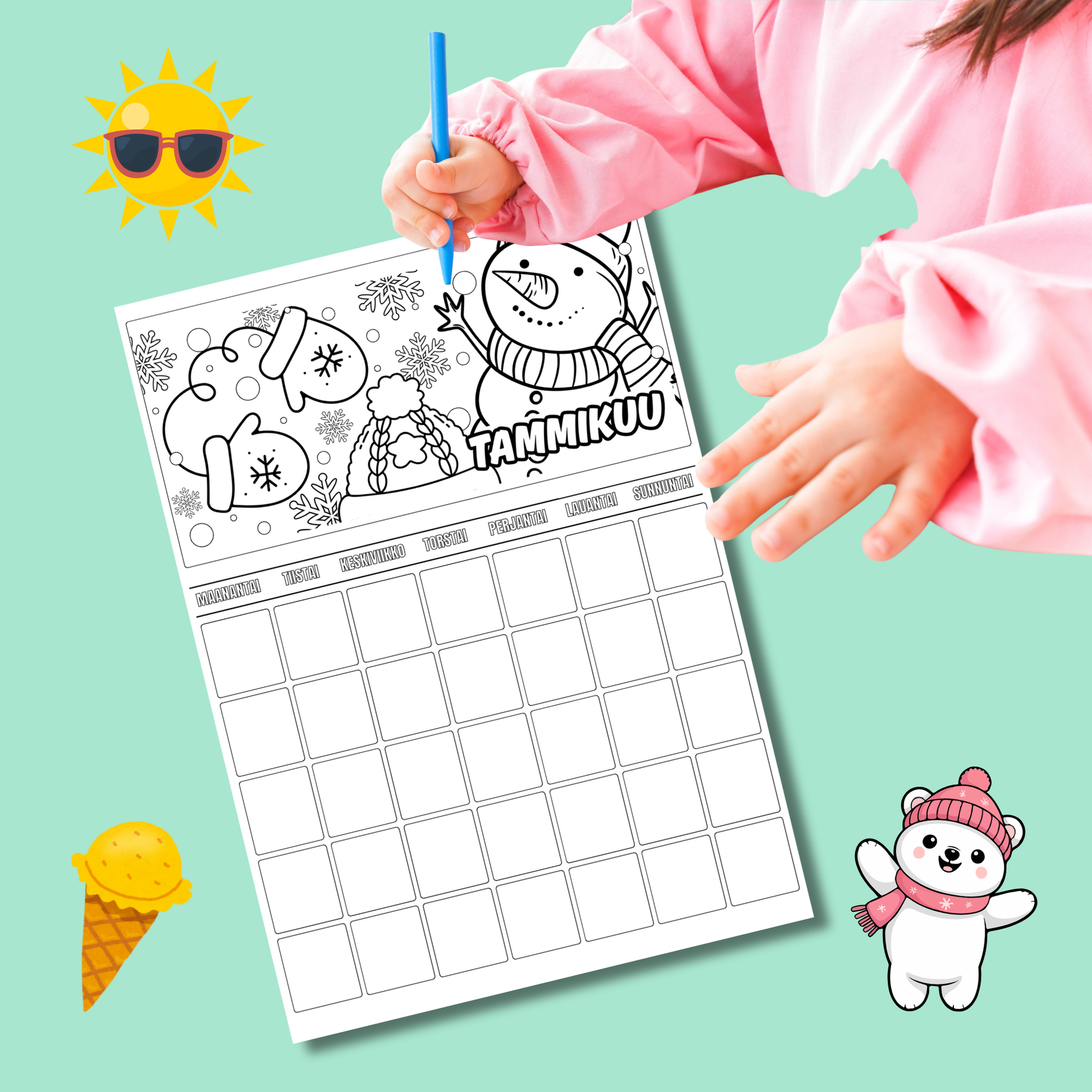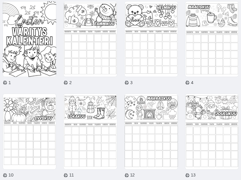 Lasten väritettävä kalenteri – koko vuosi väritettävää iloa (A4 PDF)