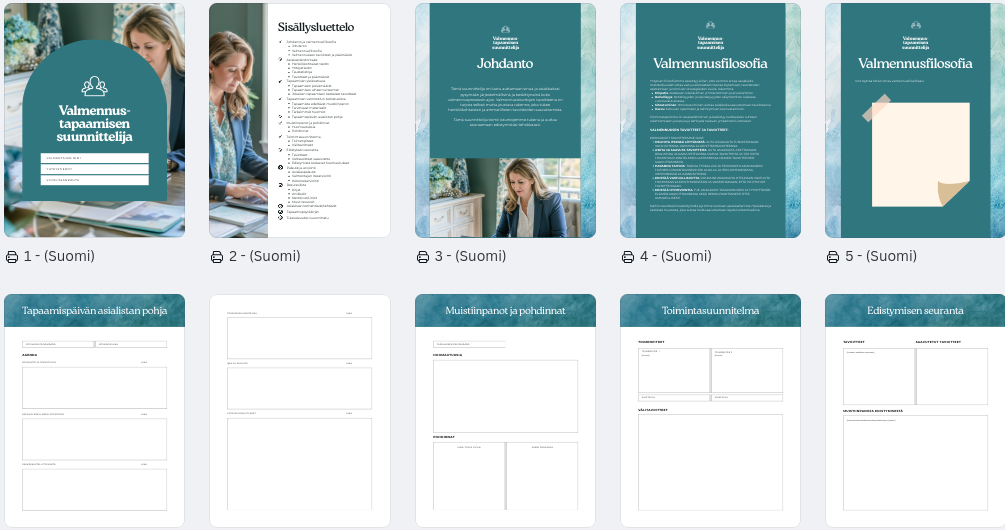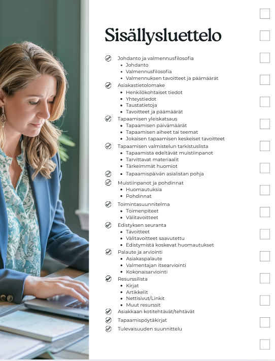 Valmennustapaamisten suunnittelija on kattava työkalu 📚🧩, joka auttaa sinua ja asiakkaitasi pysymään keskittyneinä ja motivoituneina koko valmennusprosessin ajan!
