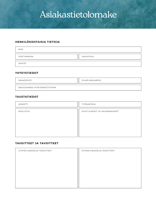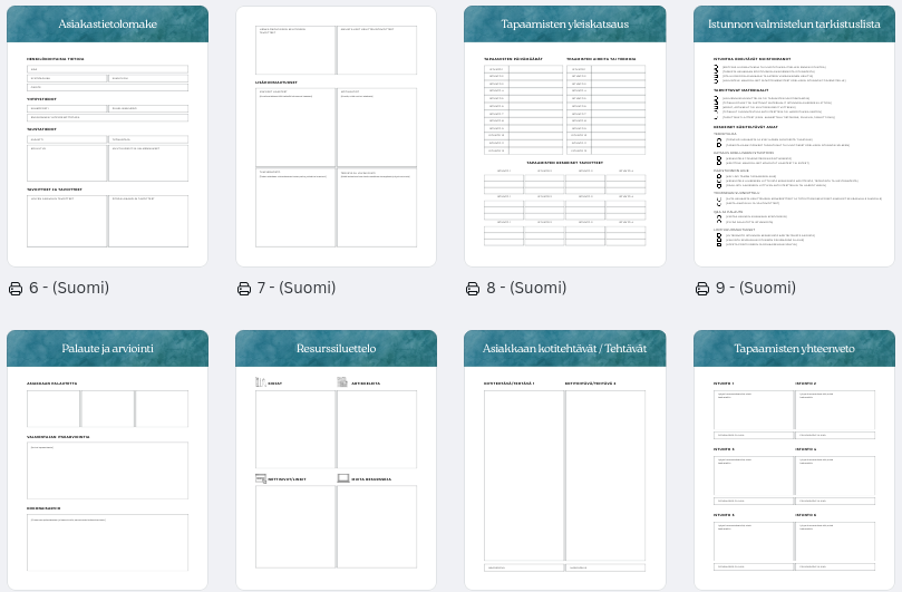 Mukana on mm. valmennusfilosofian määrittely 🧠, asiakkaan tavoitteiden kirkastaminen 🎯, istuntojen agendapohjat 📝, toimintasuunnitelmat ⚙️ ja palauteosiot 💬 – kaikki, mitä tarvitset menestyksekkään valmennussuhteen rakentamiseen.
